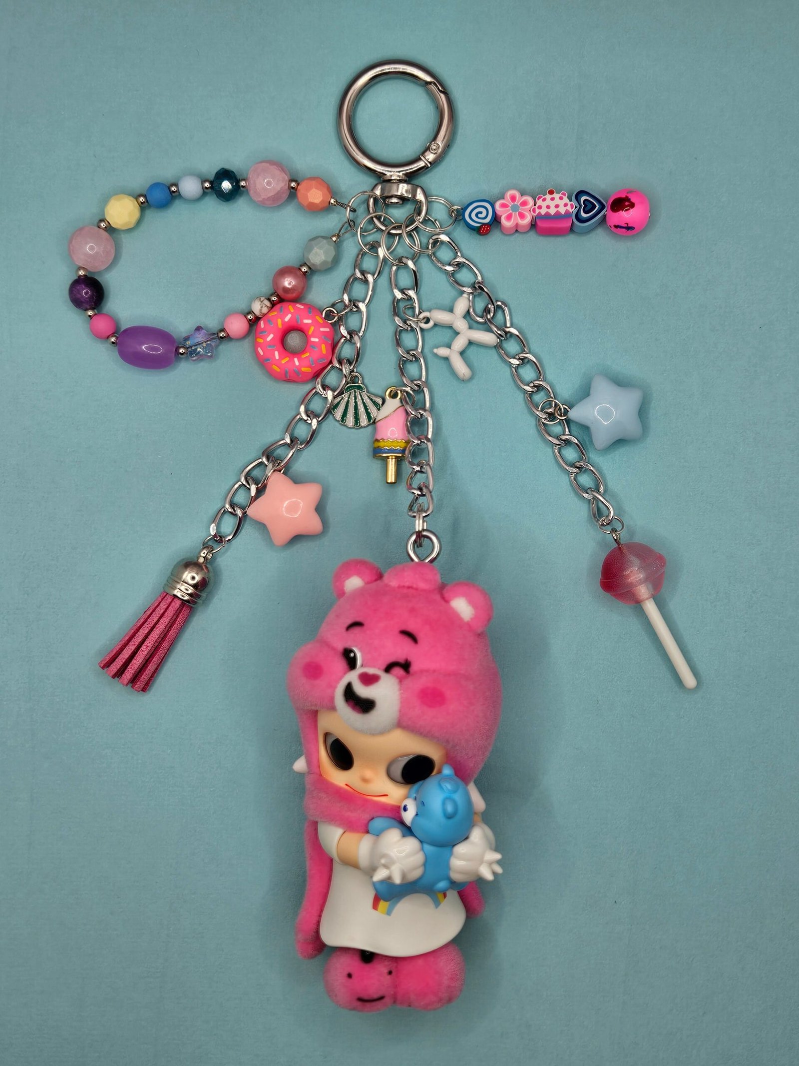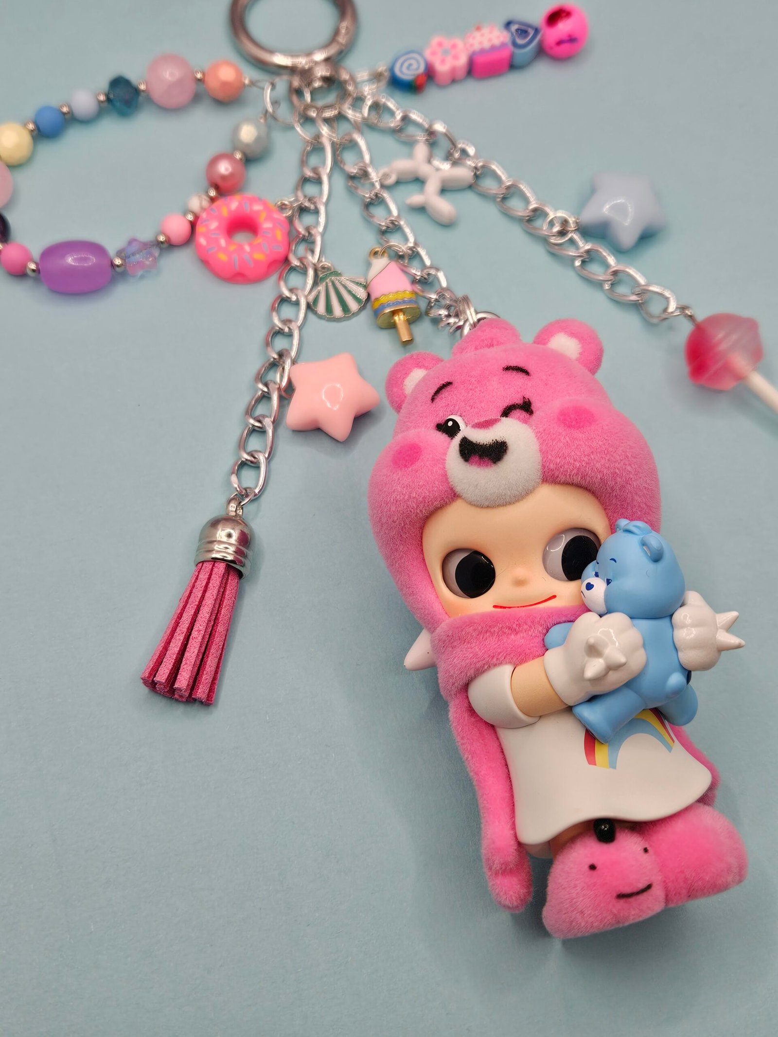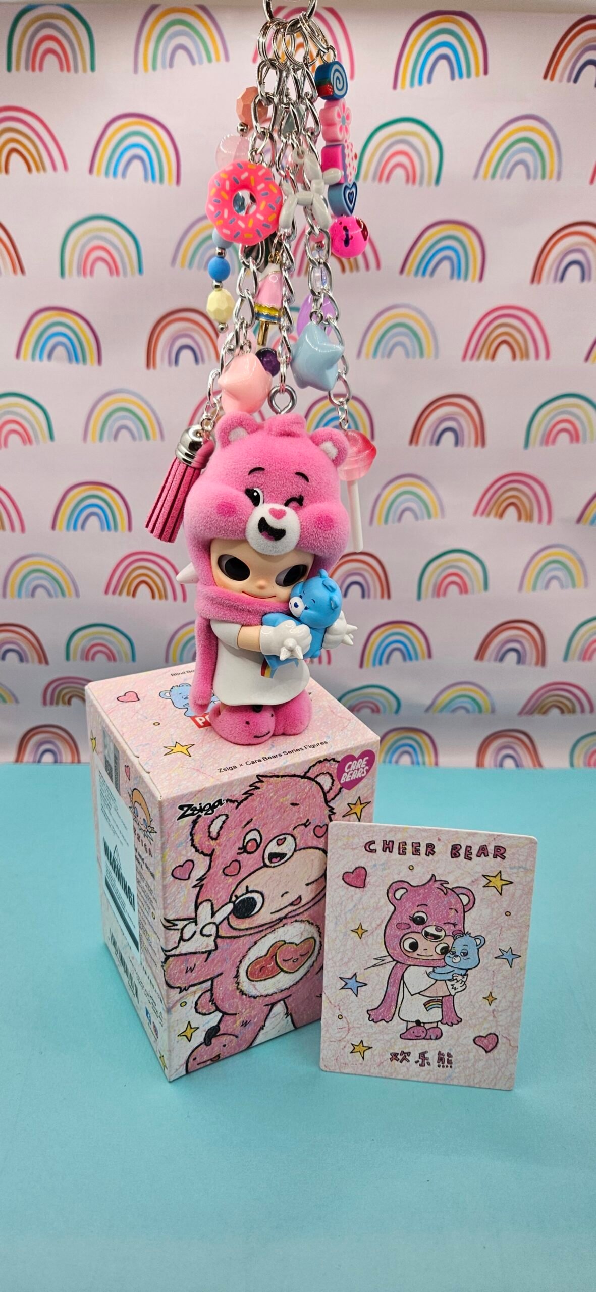 This Zsiga x Care Bear figurine is an authentic PopMart item with hand assembled charms and beads to create a keychain or bag charm for your handbag or backpack.
