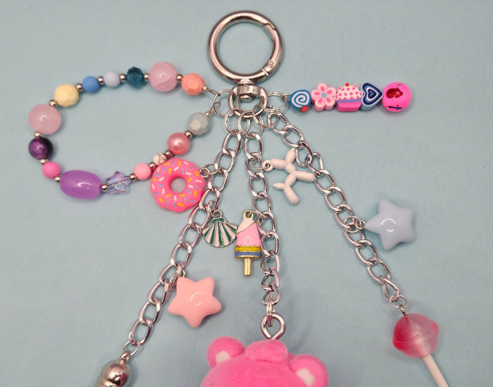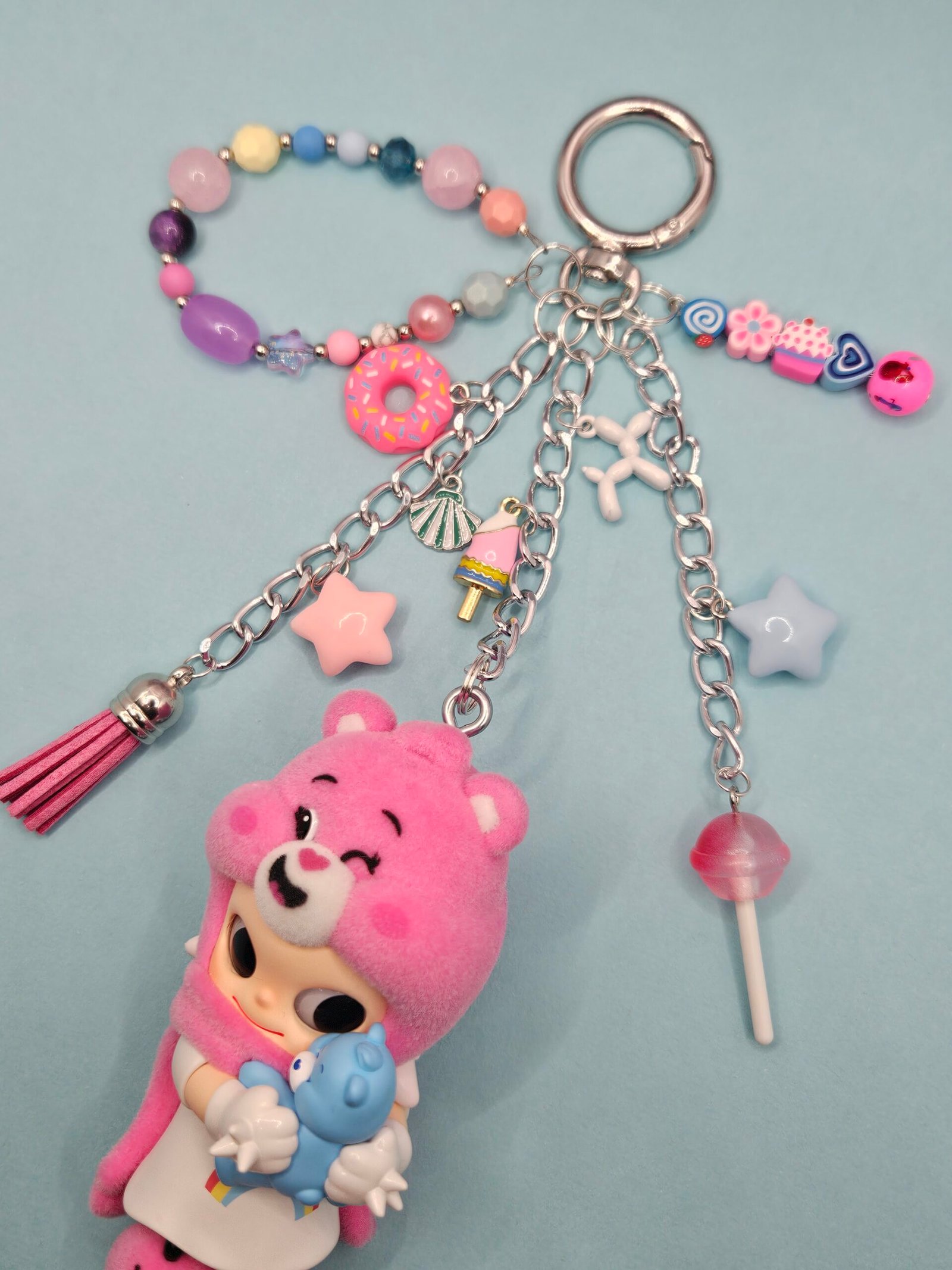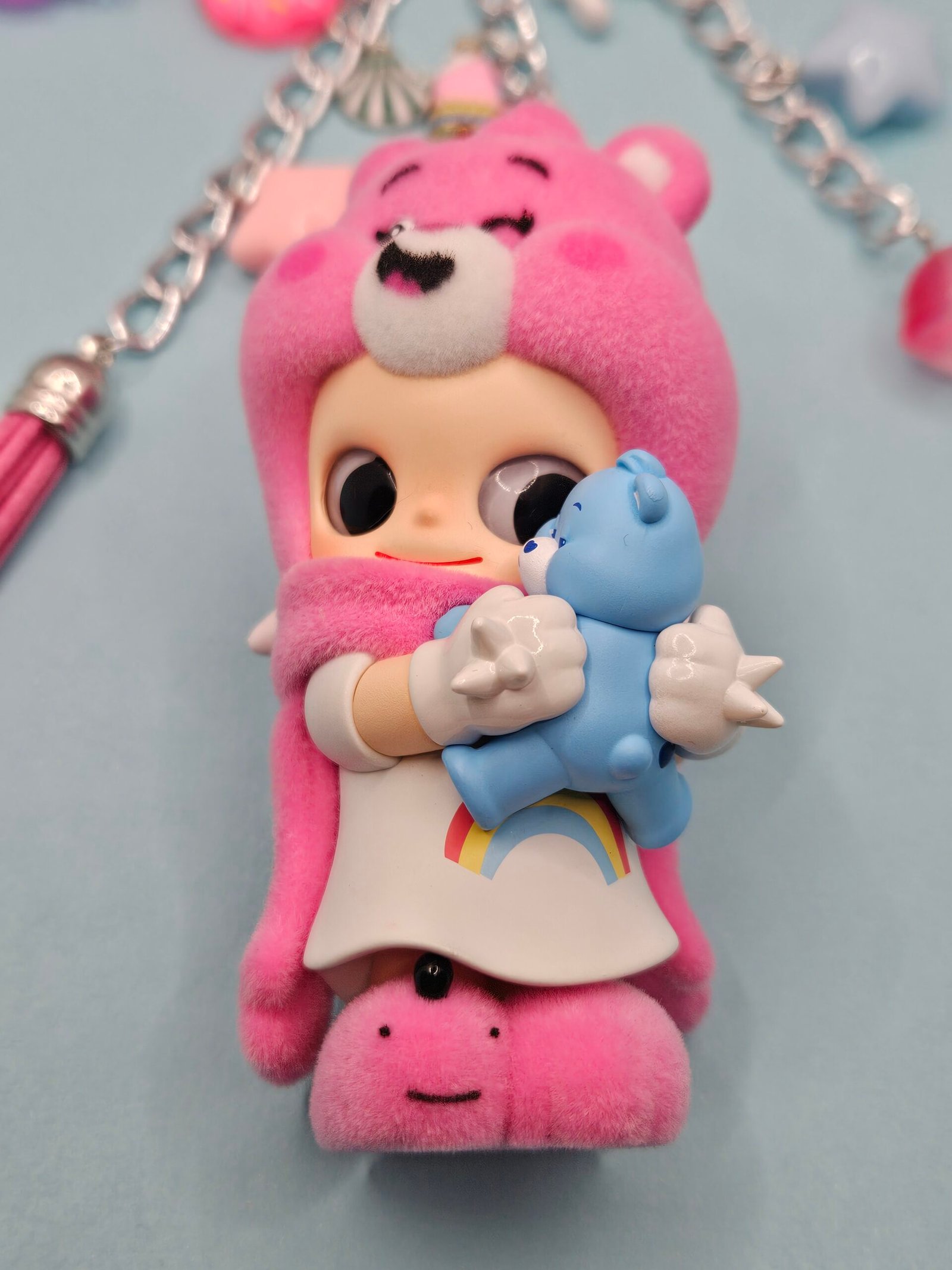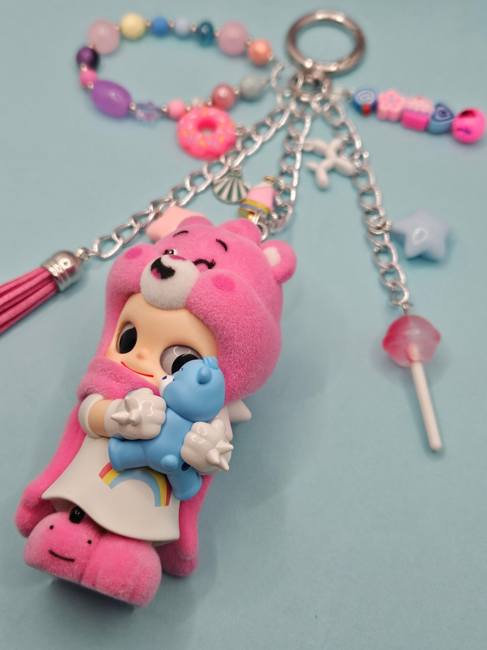 This Zsiga x Care Bear figurine is an authentic PopMart item with hand assembled charms and beads to create a keychain or bag charm for your handbag or backpack.